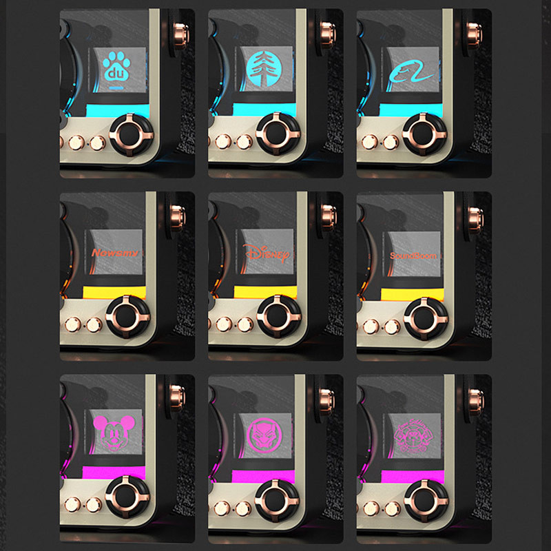 Колонка виглядає, як вінтажний арт-об’єкт із прозорим корпусом та яскравим підсвічуванням, вона не просто грає музику, а створює атмосферу та привертає увагу