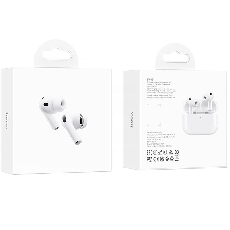 Навушники Hoco EW96 оснащені сучасним Bluetooth 6.0, що забезпечує стабільне з’єднання та високу якість передачі звуку. Чип Jerry JL AC6983 гарантує надійну роботу пристрою. Ємність батареї становить 300mAh для зарядного кейсу та 30mAh для кожного навушника, що дозволяє насолоджуватися музикою до 4 годин без підзарядки. Матеріал корпусу — ABS, що робить навушники легкими та міцними.