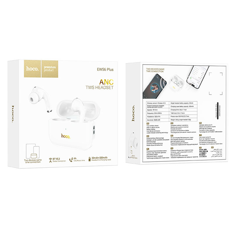 Навушники Hoco EW56 Plus ANC оснащені передовими технологіями, такими як Bluetooth 5.3 та чіп JL AC7003, що забезпечує стабільне з’єднання та високу якість звуку. Ємність батареї становить 300mAh для зарядного кейсу та 30mAh для гарнітури, що дозволяє насолоджуватися музикою до 4 годин без підзарядки та до 150 годин у режимі очікування.