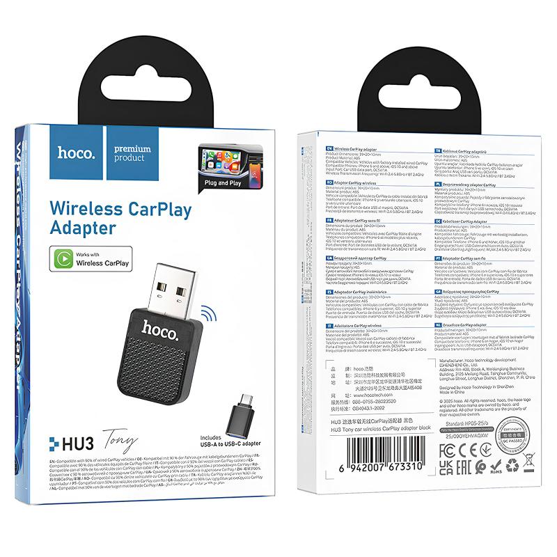 Адаптер Hoco HU3 Tony Car Wireless CarPlay — це ідеальне рішення для автолюбителів, які хочуть перетворити провідну функцію CarPlay на бездротову. Цей продукт призначений для власників автомобілів з оригінальною провідною системою CarPlay, які прагнуть до більш зручного та сучасного використання своїх пристроїв.