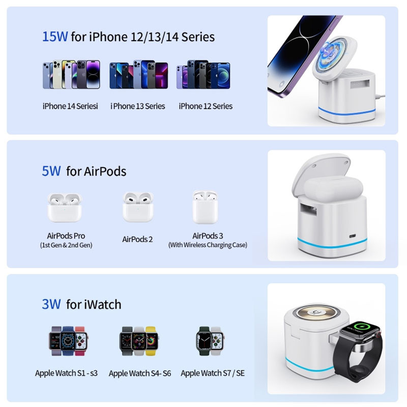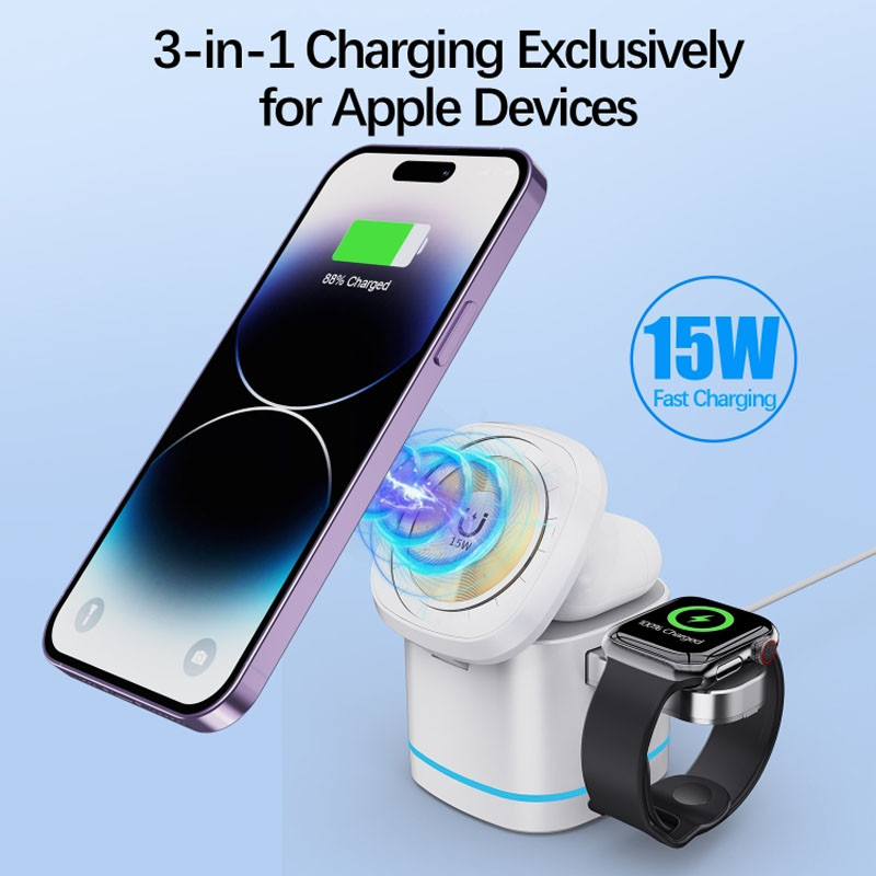 Поєднуючи функції заряджання для телефонів, навушників і годинників, ця компактна станція стане незамінним аксесуаром для робочого столу або нічного столика.