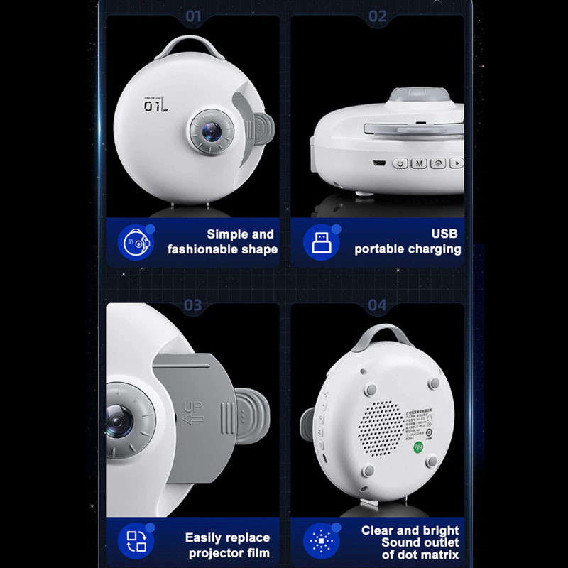 Круглий корпус проектора оснащений п’ятьма стабілізаторами, які дозволяють відрегулювати висоту проектування, а також забезпечують стійке та надійне розміщення на будь-якій поверхні.