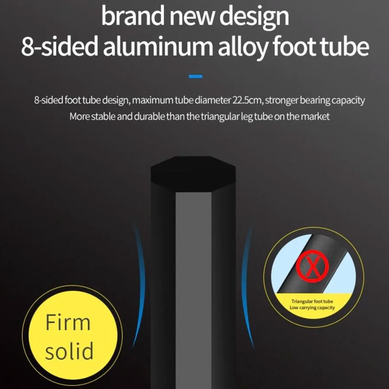 Регульована висота досягається за рахунок трьох складних алюмінієвих ніжок із гумовими наконечниками для стійкості на різних поверхнях