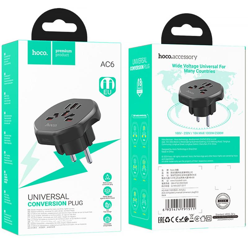 Мережевий універсальний перехідник Hoco AC6 3in1 (EU) — це ідеальне рішення для тих, хто часто подорожує або працює з різними пристроями. Цей адаптер підходить для використання в Європі та забезпечує надійне підключення до електромережі, що робить його незамінним аксесуаром для бізнесу та особистого використання.