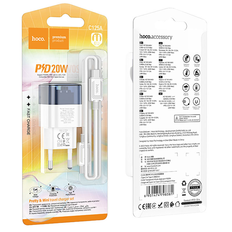 МЗП Hoco C125A Transparent PD20W (1USB-C) + кабель Type-C to Type-C