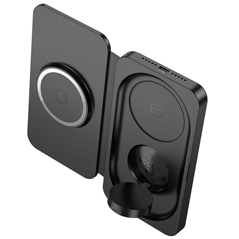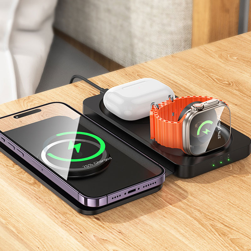 Бездротовий зарядний пристрій Hoco CQ13 Triumph 3in1 travel folding — це ідеальне рішення для тих, хто цінує зручність та функціональність. Цей пристрій призначений для одночасної зарядки телефону, гарнітури та iWatch, що робить його незамінним аксесуаром для сучасних користувачів.