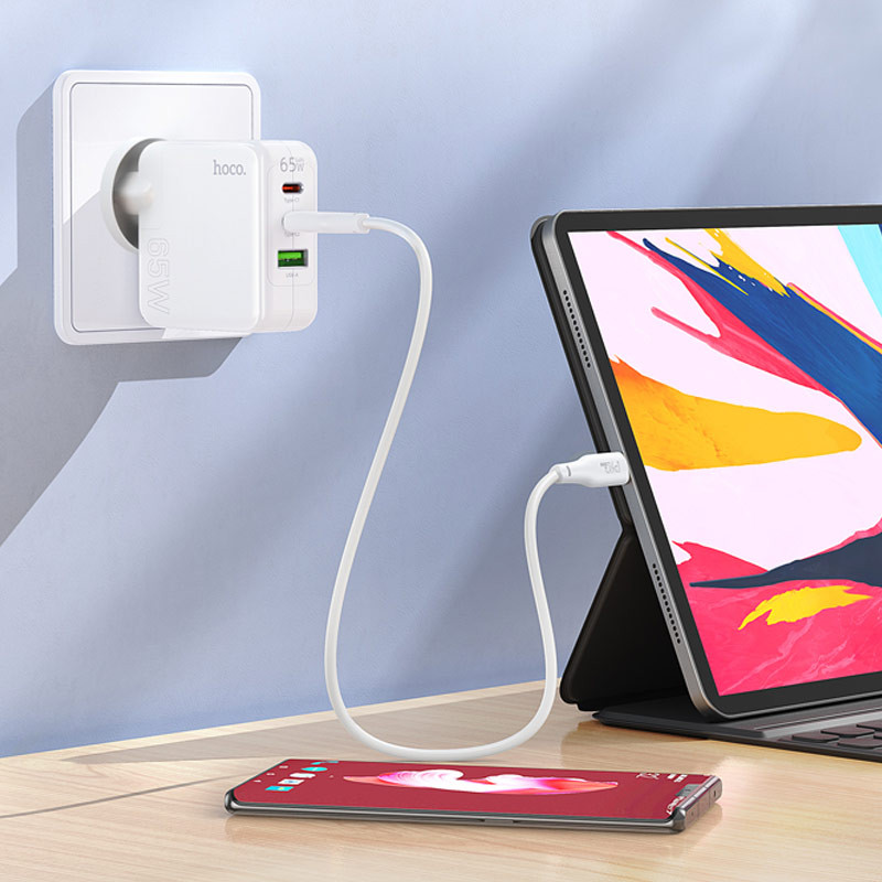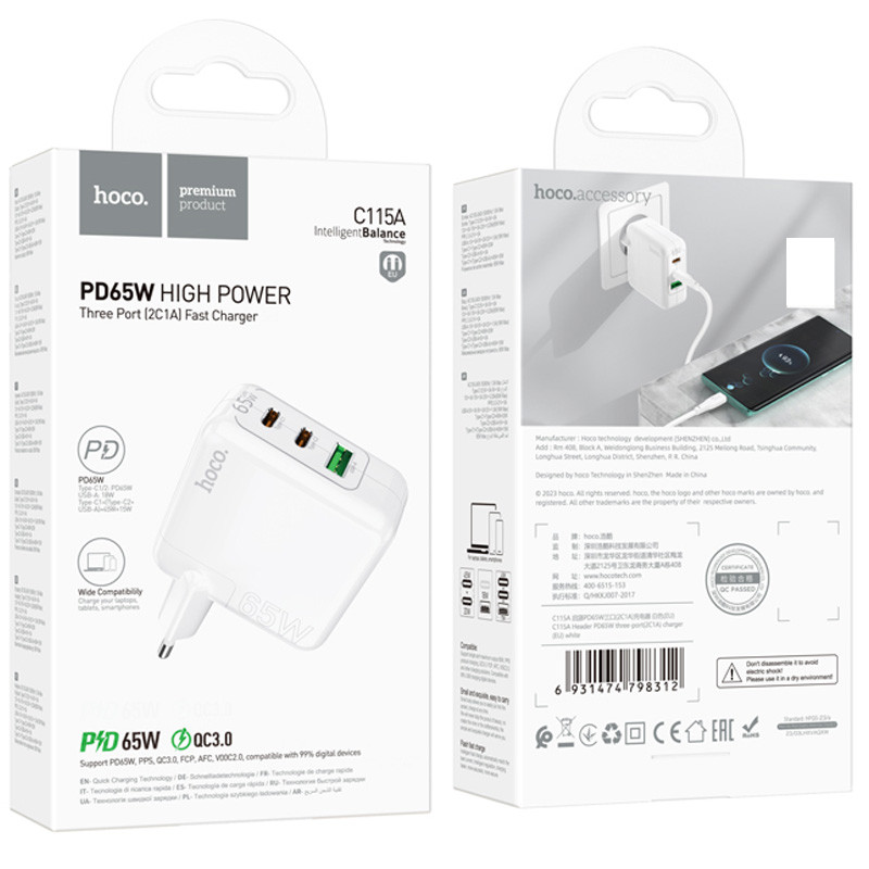 Hoco C115A підтримує технологію Power Delivery, що дозволяє заряджати пристрої з високою швидкістю. Це зарядний пристрій оснащено двома портами USB-C та одним портом USB-A, що робить його універсальним рішенням для зарядки різних гаджетів. Завдяки потужності 65 Вт, воно здатне швидко заряджати навіть найвимогливіші пристрої, такі як ноутбуки та планшети.